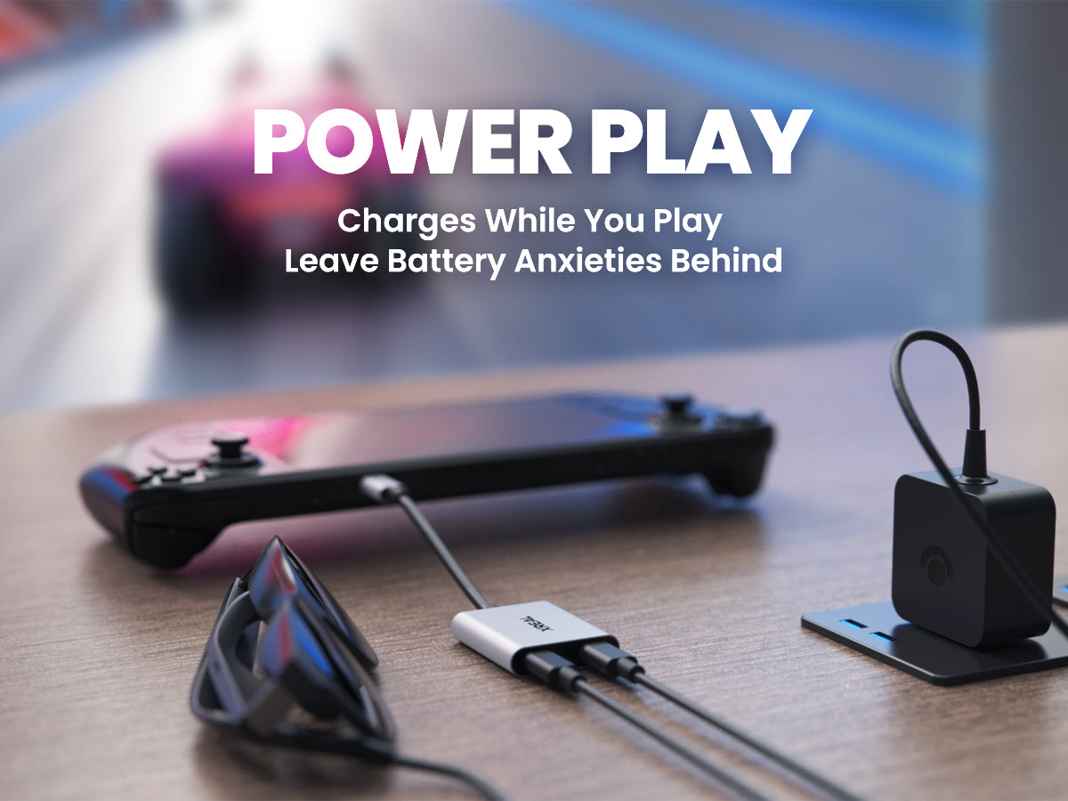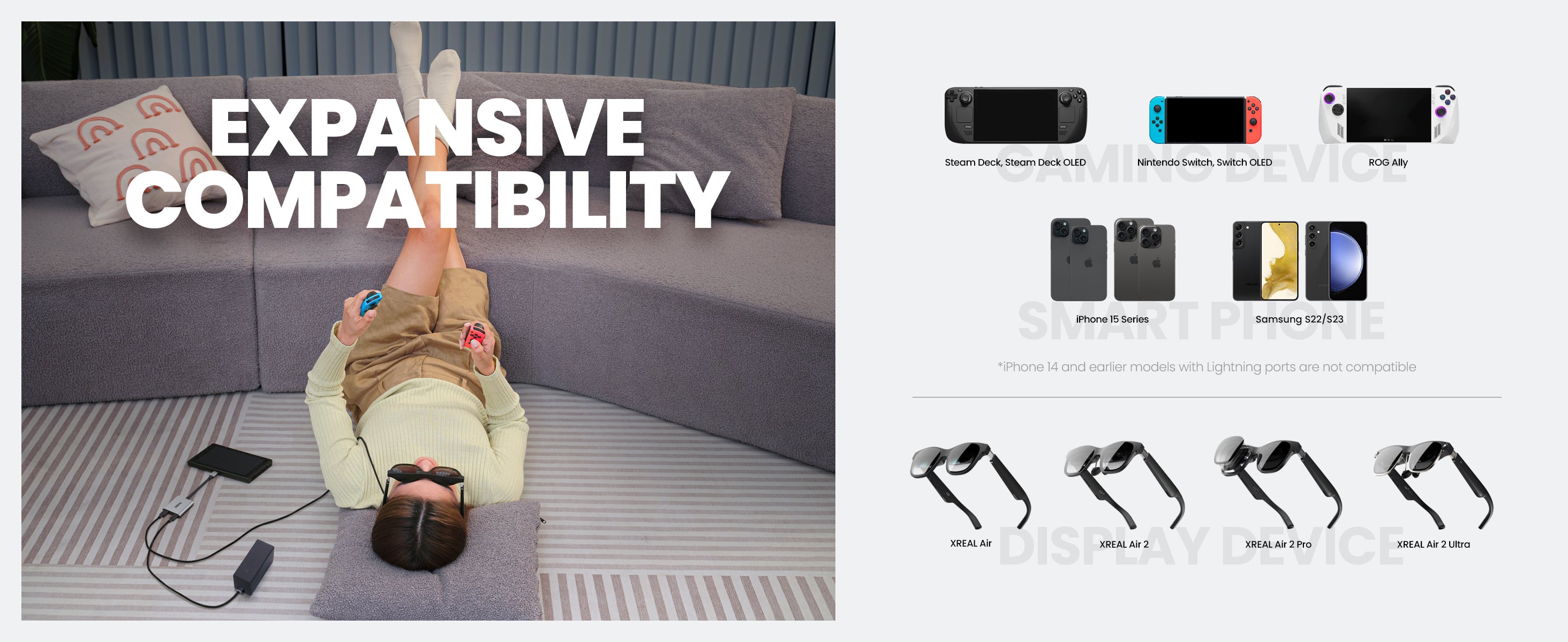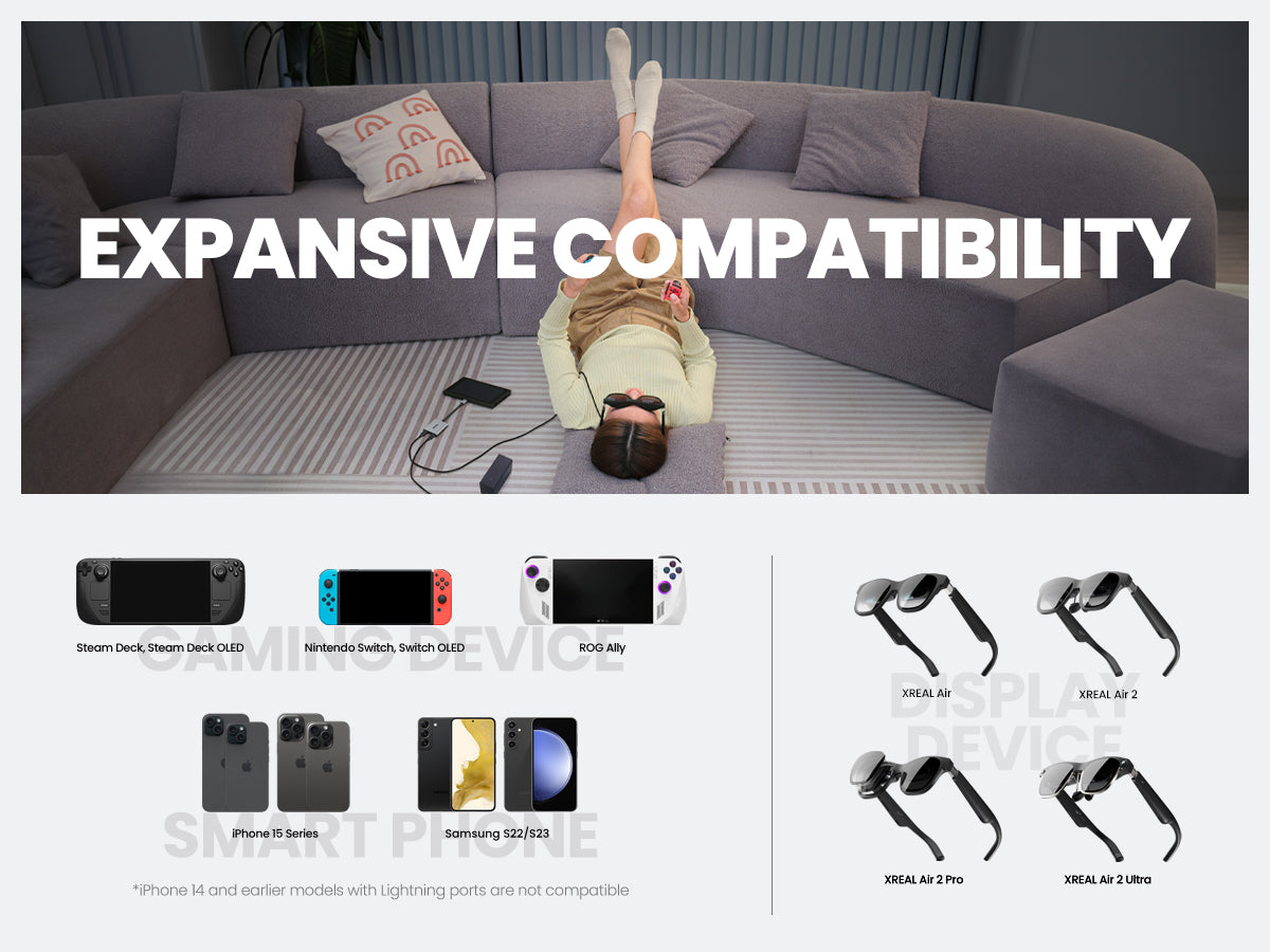 Power Play: Power up your gaming sessions and streaming while using XREAL AR glasses. Charge and play, so that your gaming adventures are never cut short by a drained battery again.