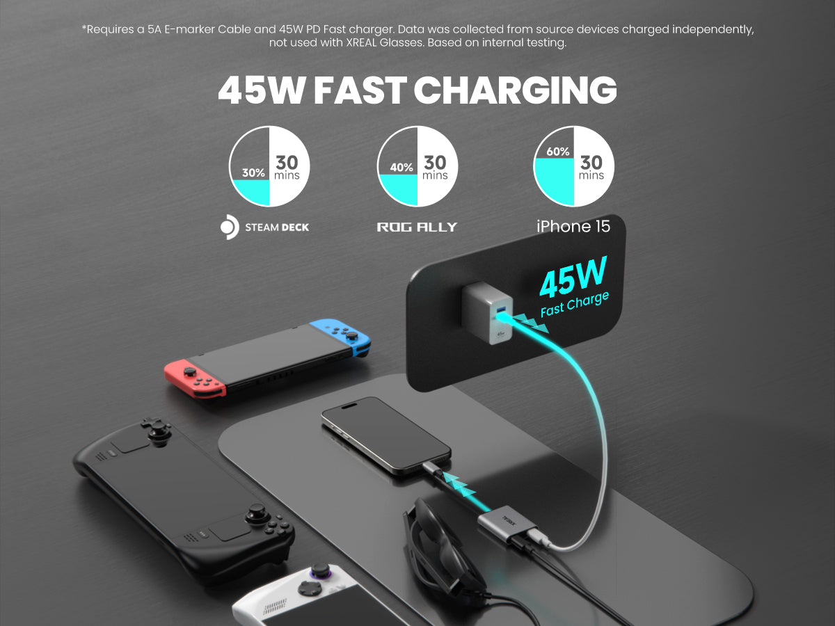 45W Fast Charging: Deliver high-speed 45W charging for Steam Deck or iPhone 15, and other devices, all while using your XREAL AR glasses.