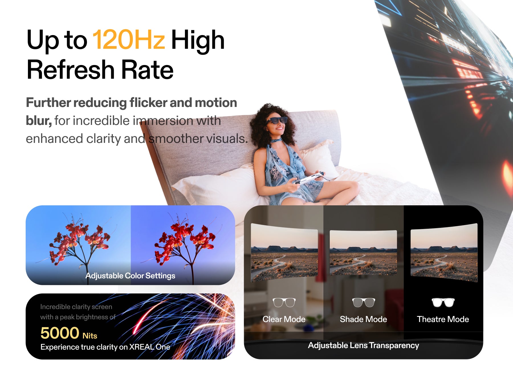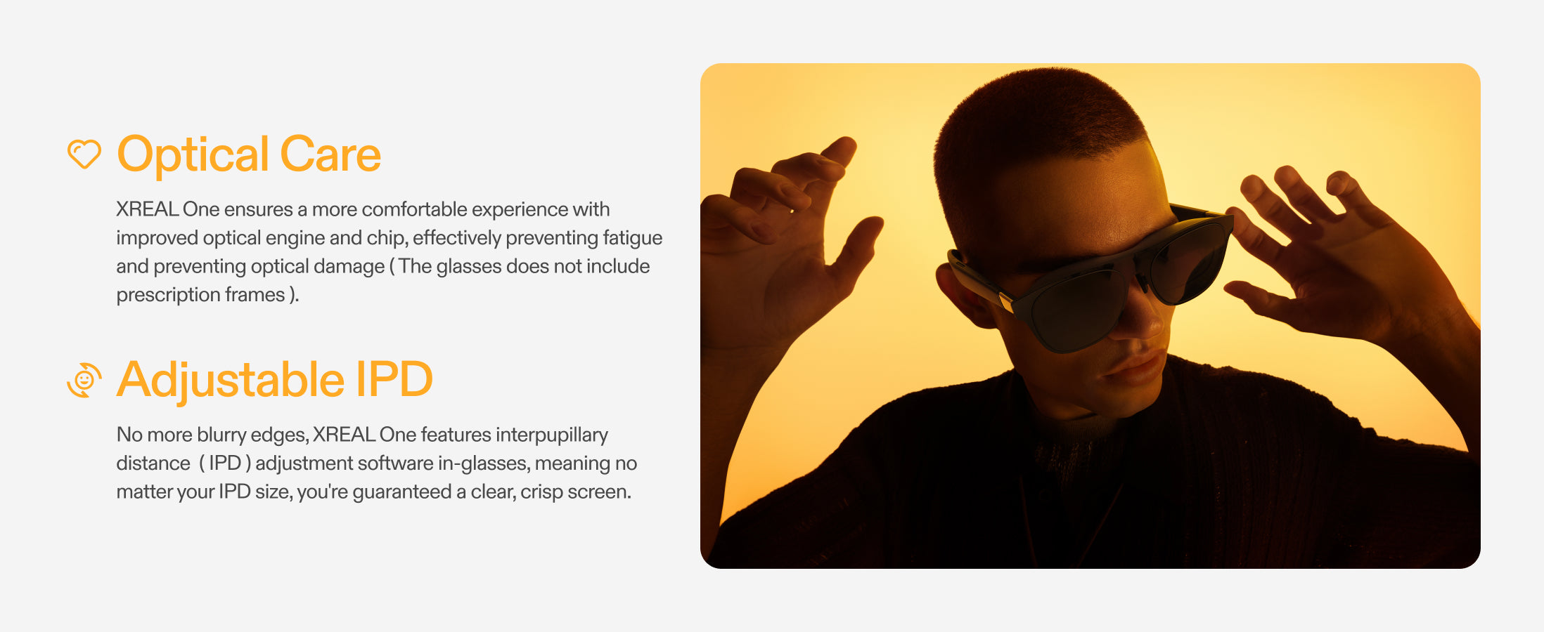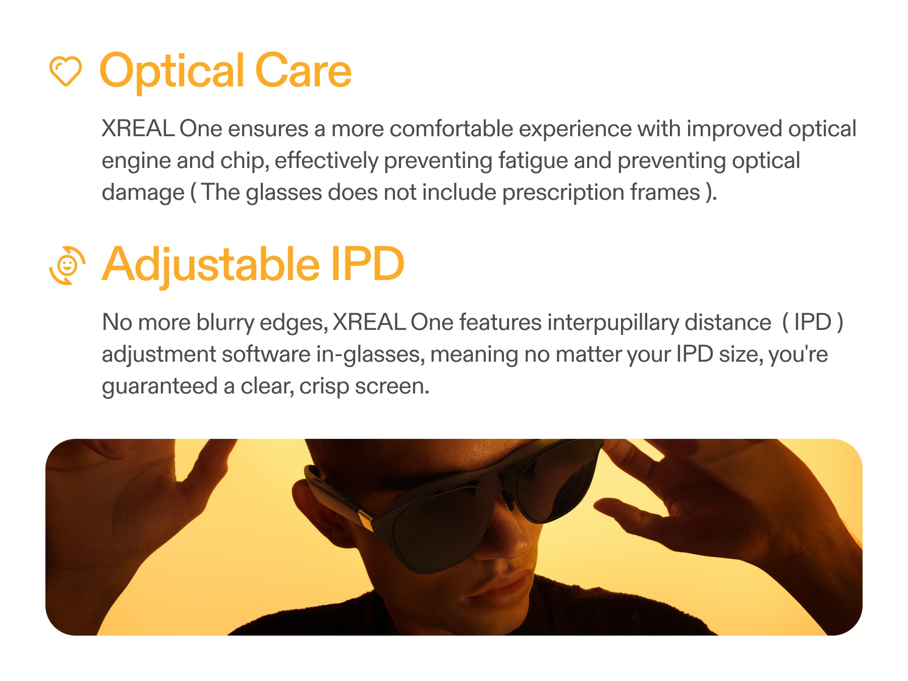 Both XREAL One and XREAL One Pro are advanced, AR devices with a built-in chipset that has revolutionized spatial displays. Compared to the XREAL One, the XREAL One Pro has a larger FOV (field of view), with a marginally brighter virtual screen, both of which enhance the visual experience.XREAL One Pro features a new and improved display system that significantly reduces outside light interference during use and reduces the image reflection sometimes seen on the front of the glasses, protecting user privacy.Additionally, XREAL One Pro features thinner and more lightweight front frame, giving it an inconpicuous appearance.XREAL One Pro offers multiple interpupillary distance (IPD) options to accommodate users with different IPD needs.